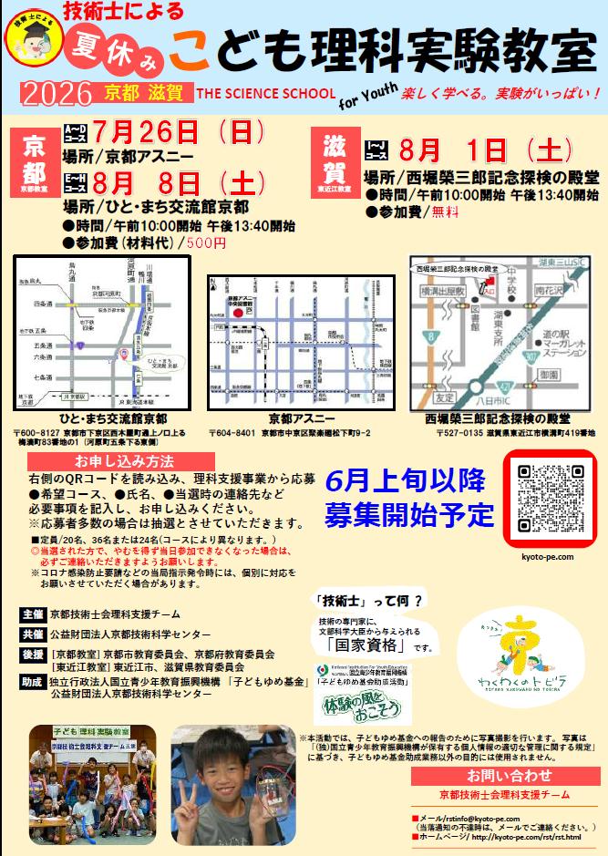 残念なことに、その子供たちの理科離れが進んでいるという事実は、我々技術者にとっては看過できない大きな問題と考えています。技術プロである我々技術士がこれらの問題に対して何が出来るかを考えた時、自らが業務で培った実体験と専門知識をもとに、理科がどのように社会に役立っているか、どんなに大切か、どんなに楽しいかを実験や工作を通して子どもたちに実感させ、未来に夢と希望を持つ創造性に富んだ理科好きな子供を育てることが我々技術者の使命と考え、京都技術士会のメンバー有志による理科支援チーム通称RST)を中心に2006年から活動しています。